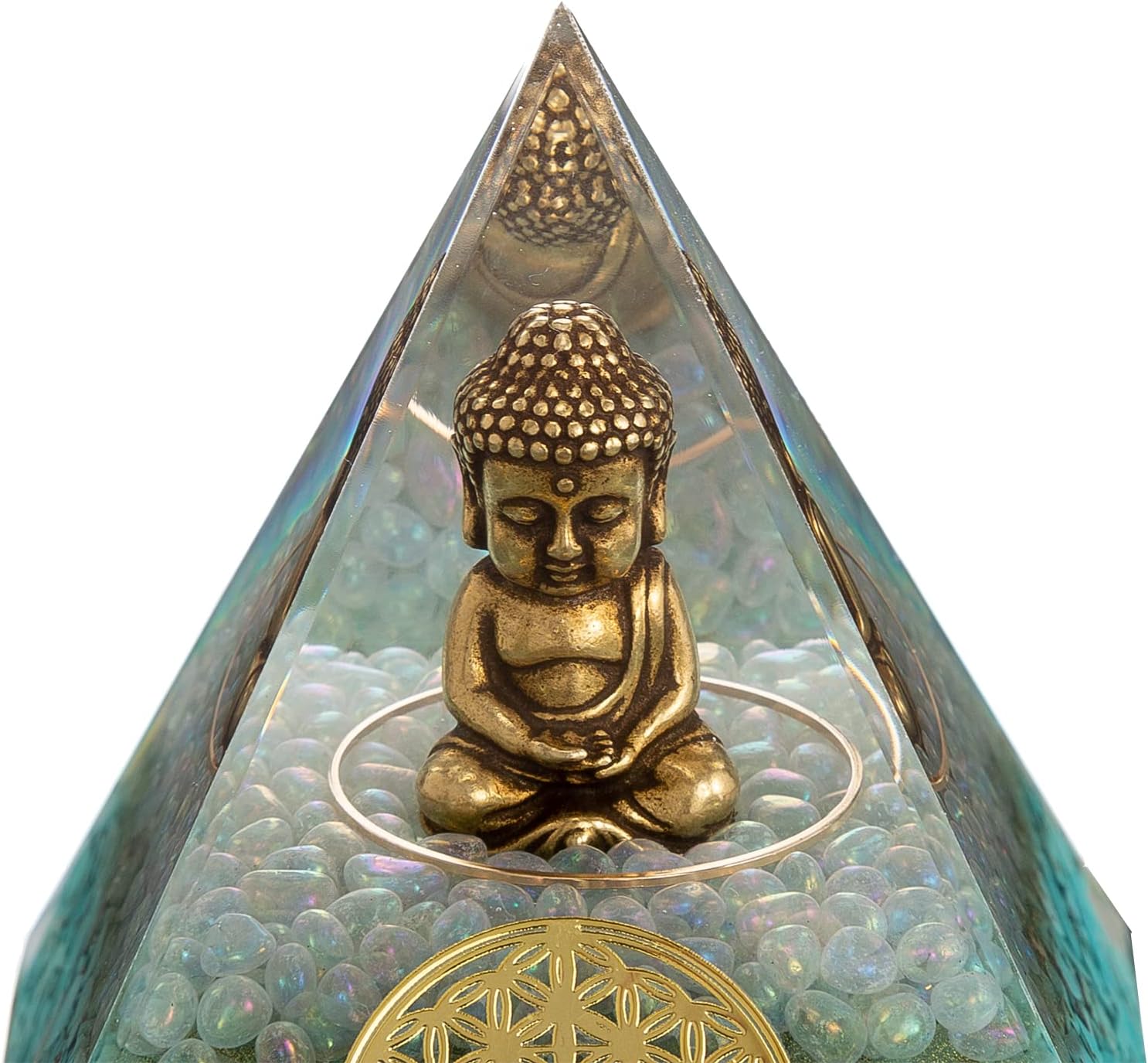 Little Buddha Statue in Healing Crystal Organite Pyramid - Turquoise with Baby Buddha Figurine, Reiki Chakra Meditation Buddha Decor