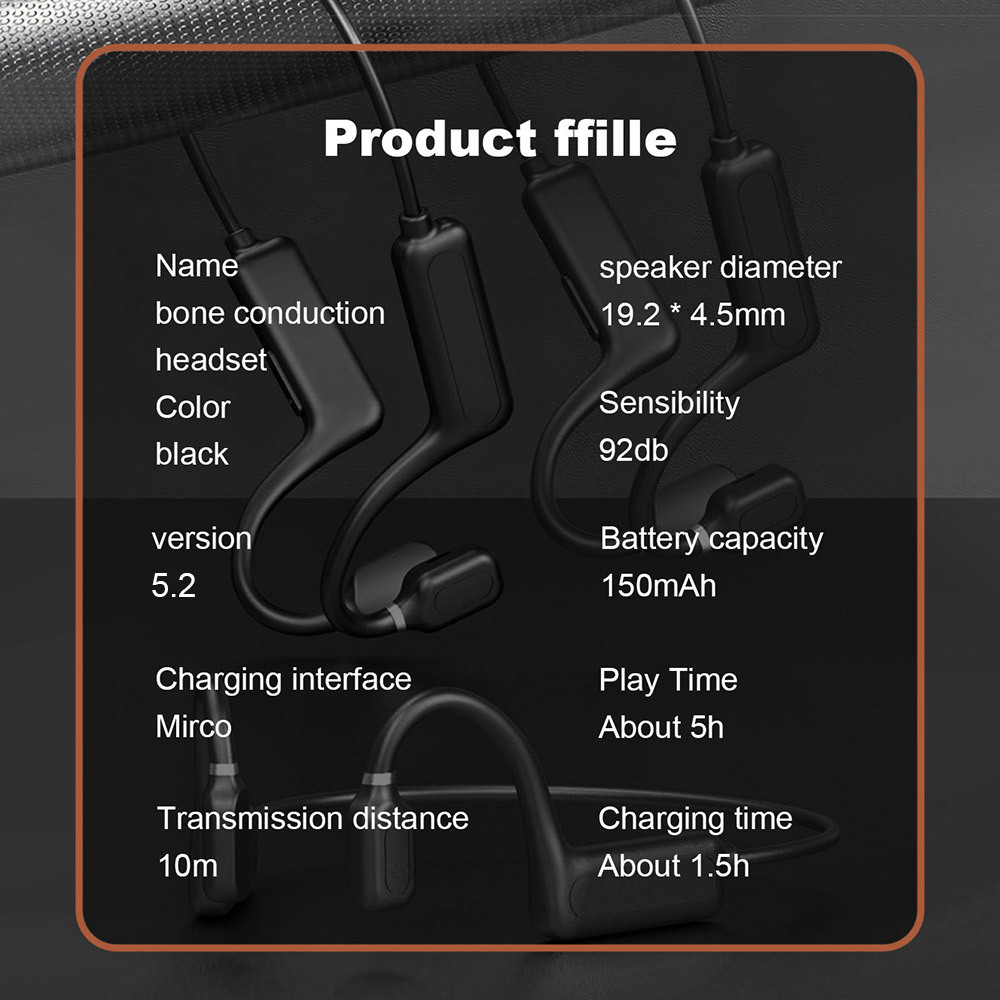 Input power: 5V / 1A Bluetooth version: 5.2 Capacity: 150mah Transmission distance: 10M Operation mode: press key Charging time: 1.5 hours Sensitivity: 92dB Talk time: 5 hours Playback time: 5 hours Support system: all Bluetooth enabled devices and mobile phones Package content: 1 * Bluetooth headset 1 * USB charging 1 * User Manual
